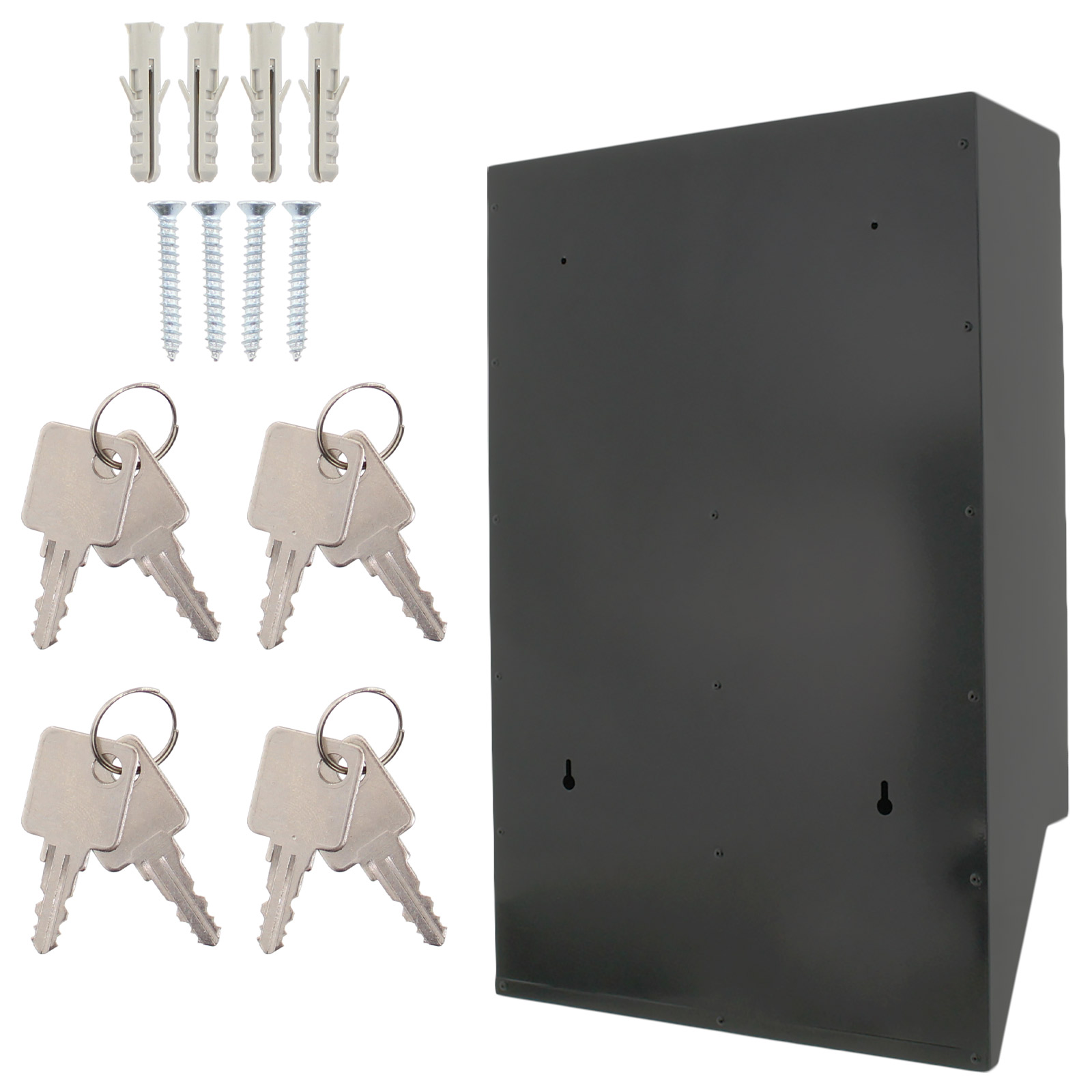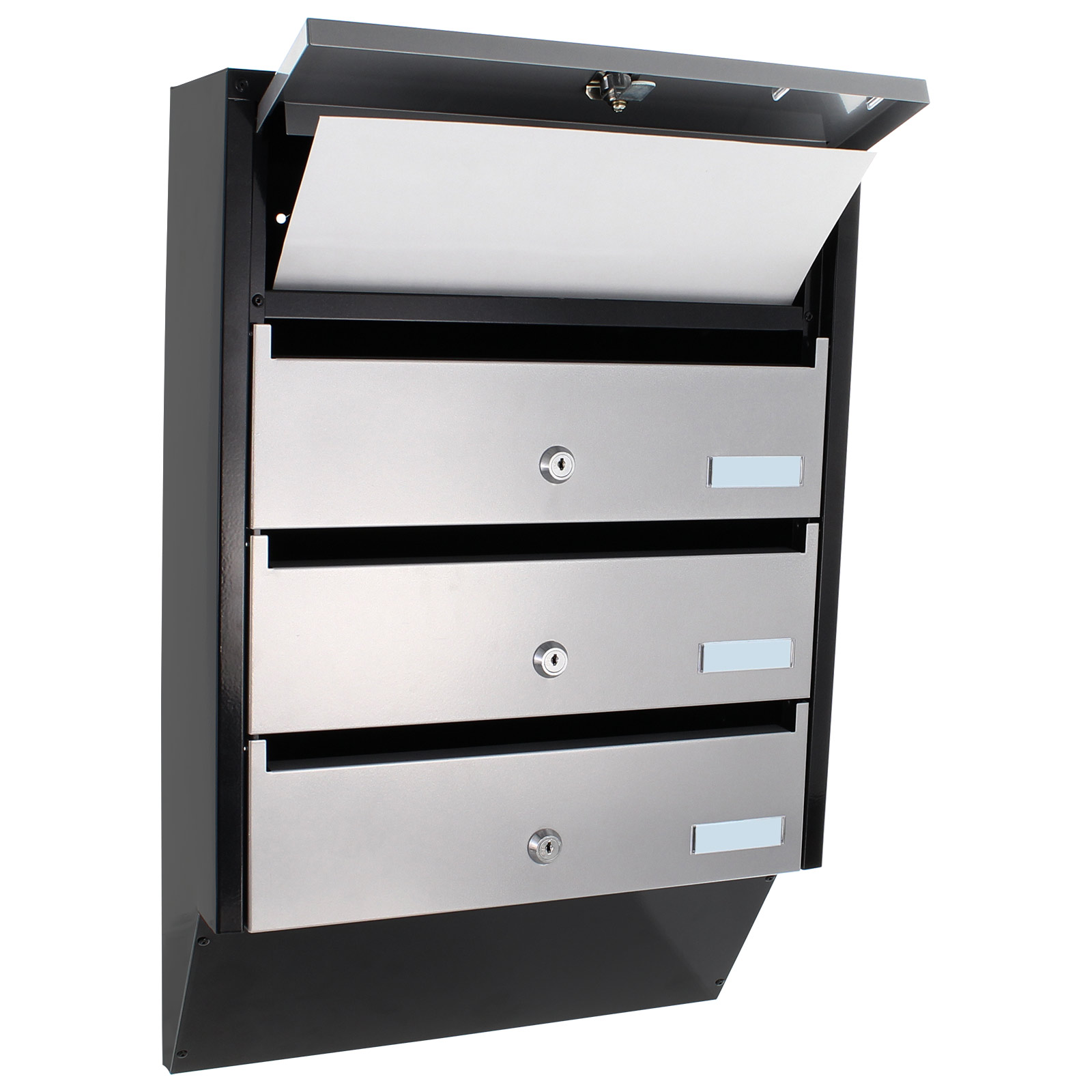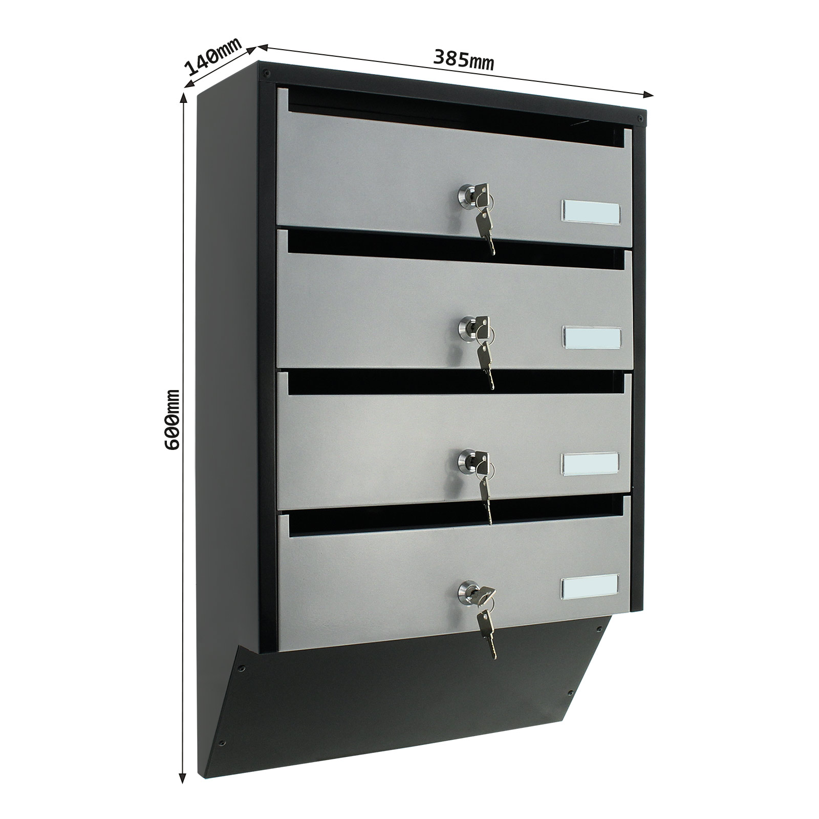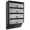 Hlavní výhody: 4 samostatné složky Cylindrický zámek s 2 klíči pro každou složku Kvalitní ocel tloušťky 0,8 mm Samostatné jmenovky Přední otvor pro poštu Představujeme poštovní schránku se zajímavým úzkým designem, která je vhodná pro bytové domy nebo polyfunkční objekty. V jedné schránce jsou celkově 4 složky se samostatnými popisky a cylindrickým zámkem na klíč. Její design pomůže ušetřit množství místa, přičemž jednotlivé složky se otevírají směrem nahoru. Tento typ poštovní schránky můžete libovolně rozšiřovat přidáním dalších stejných schránek. Potřebný materiál pro upevnění na stěnu je součástí balení.