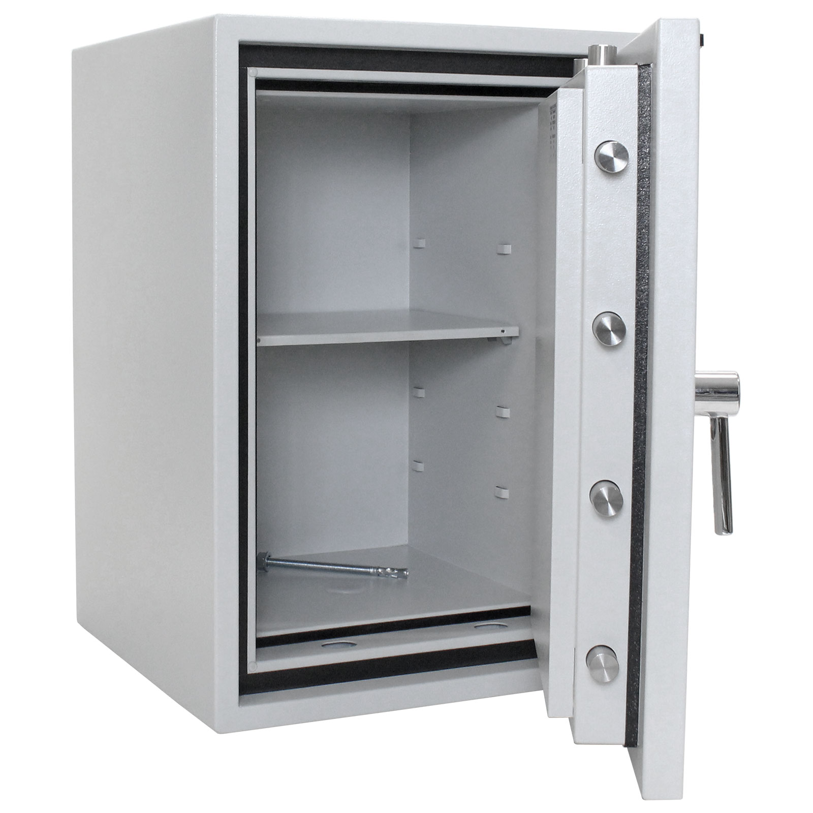 Hlavní výhody: Certifikovaný elektronický zámek (ČSN EN 1143) Bezpečnostní třída II Ohnivzdornost po dobu 60 minut pro papír Napájení 1 x 9V baterií (není součástí balení) Hlavní a 9 vedlejších kódů Možnost úschovy i zbraní a munice dle č.190/2003 Sb. z. Tloušťka dveří 110 mm Dvouplášťové stěny o tloušťce 70 mm Polička uvnitř Otevření dveří až do 180° Otvory pro ukotvení na spodní strane Certifikovaný ohnivzdorný trezor s modelovým označením Fire Master disponuje certifikovaným elektronickým zámkem, který je napájen 9V baterií. Trezor umožňuje zadat hlavní (master) a 9 vedlejších (user) kódů. Trezor má certifikát bezpečnostní třídy II (ČSN EN 1143) a je v něm v případě potřeby možné kromě klasických věcí, šanonů a podobně, uschovat i zbraně a munici. Trezor je ohnivzdorný, a to až po dobu 60 minut pro papírové dokumenty. Uvnitř trezoru se nachází polička. Dveře lze otevřít do úhlu 180° ak upevnění slouží otvory na spodní straně trezoru. Materiál pro ukotvení je součástí balení. Kování zvyšuje celkovou vnější hloubku trezoru o 60 mm.