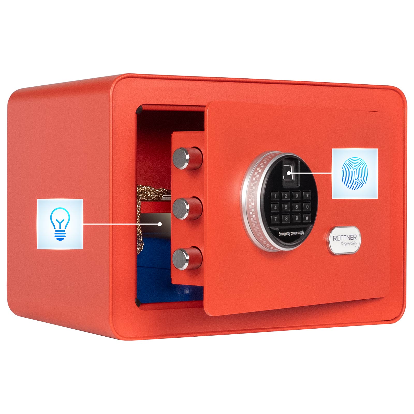 Hlavní přednosti jsou především Elektronický zámek včetně snímače otisků prstů 1 hlavní kód / 1 uživatelský kód Mechanické nouzové otevírání klíčem .